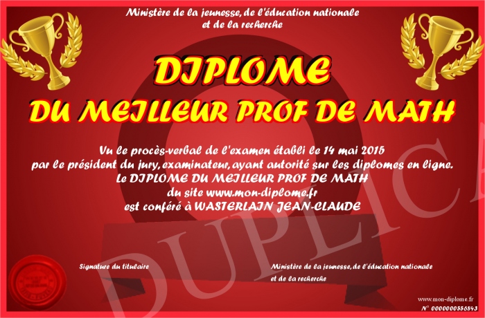 Envoyez par email votre DIPLOME DU MEILLEUR PROF DE MATH personalisé