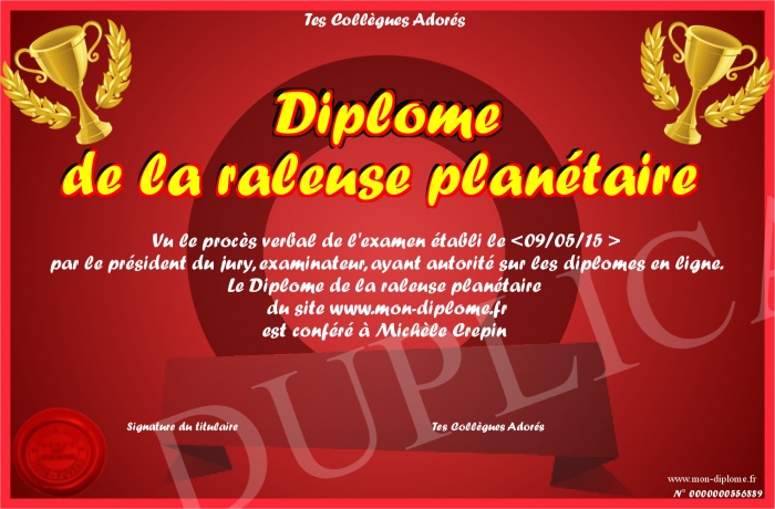 Envoyez par email votre Diplôme de la raleuse planétaire personalisé