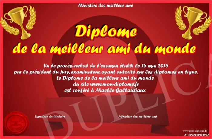 Envoyez par email votre Diplôme de la meilleur ami du monde personalisé