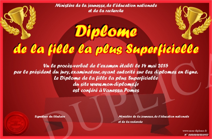 Envoyez par email votre Diplôme de la fille la plus Superficielle personalisé