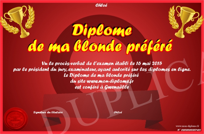 Envoyez par email votre Diplôme de ma blonde préféré personalisé