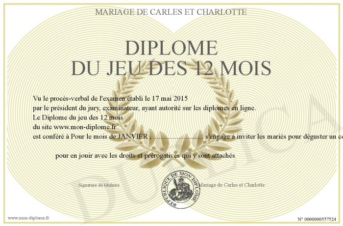 Envoyez par email votre Diplome du jeu des 12 mois personalisé