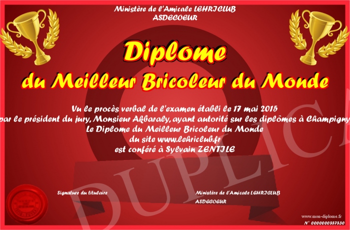 Envoyez par email votre Diplôme du Meilleur Bricoleur du Monde personalisé