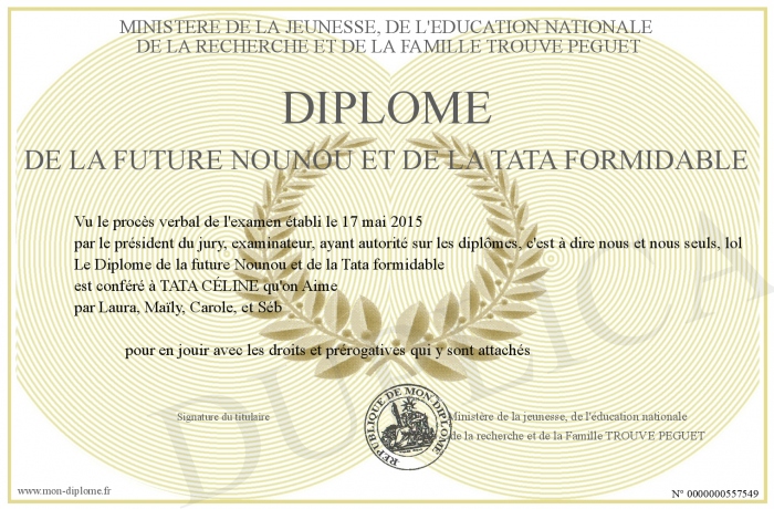 Envoyez par email votre Diplôme de la future Nounou et de la Tata formidable personalisé