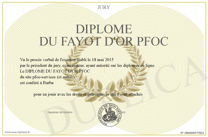 Envoyez par email votre Diplôme du Fayot d'or PFOC personalisé