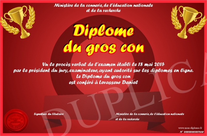 Envoyez par email votre Diplôme du gros con personalisé