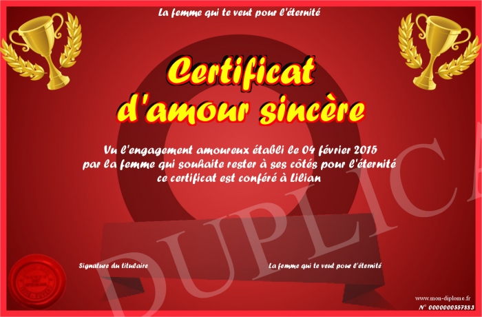 Envoyez par email votre Certificat d'amour sincère personalisé