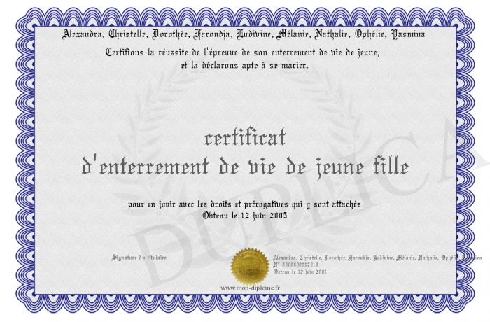 Envoyez par email votre certificat d'enterrement de vie de jeune fille personalisé