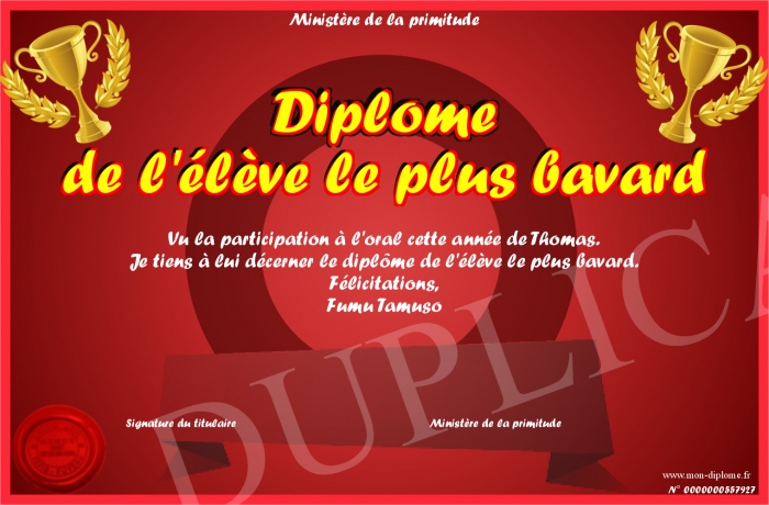 Envoyez par email votre Diplôme de l'élève le plus bavard personalisé