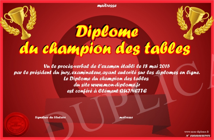 Envoyez par email votre Diplome du champion des tables personalisé