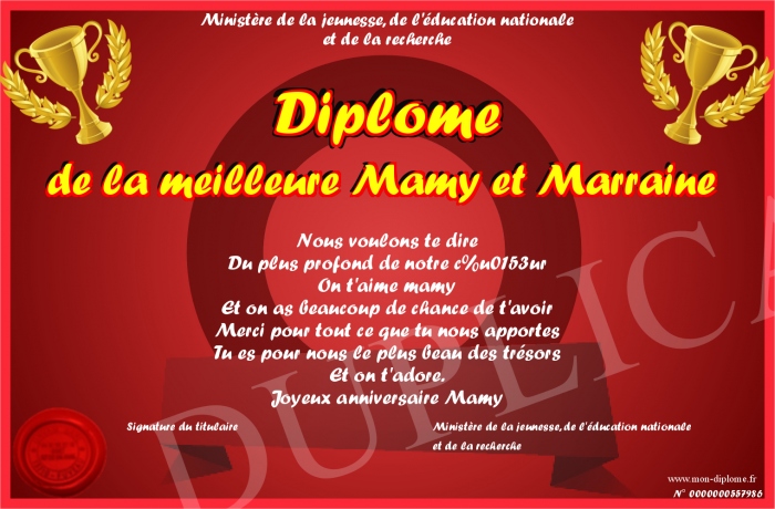 Envoyez par email votre Diplôme de la meilleure Mamy et Marraine personalisé