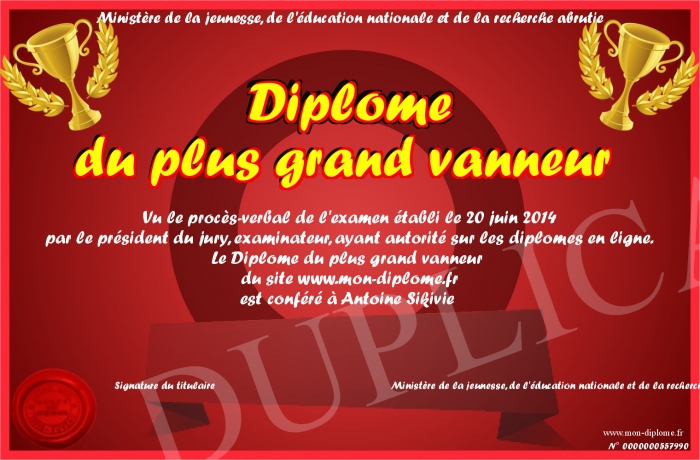 Envoyez par email votre Diplôme du plus grand vanneur personalisé
