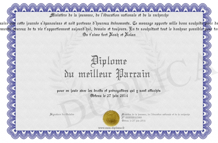 Envoyez par email votre Diplôme du meilleur Parrain personalisé