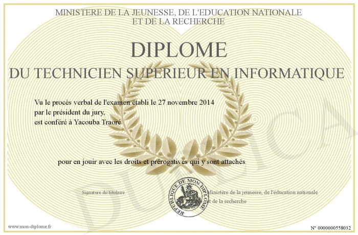 Envoyez par email votre Diplôme du Technicien Superiéur en Informatique personalisé