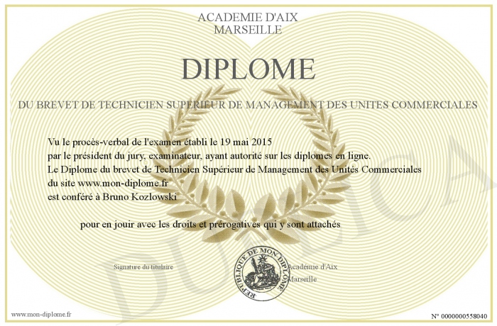 Envoyez par email votre Diplôme du brevet de Technicien Supérieur de Management des Unités Commerciales personalisé