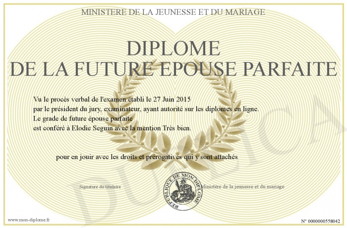 Envoyez par email votre Diplôme de la future épouse parfaite personalisé