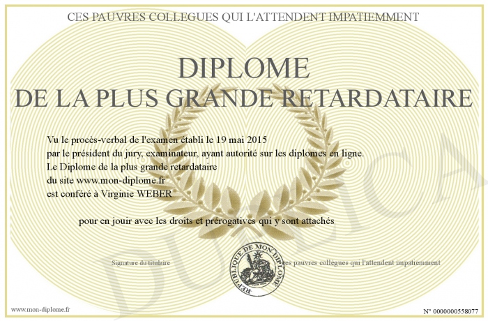 Envoyez par email votre Diplôme de la plus grande retardataire personalisé