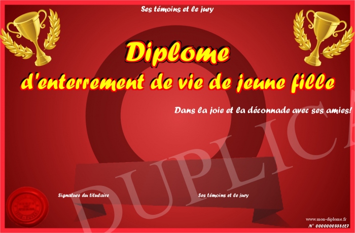 Envoyez par email votre Diplôme d'enterrement de vie de jeune fille personalisé