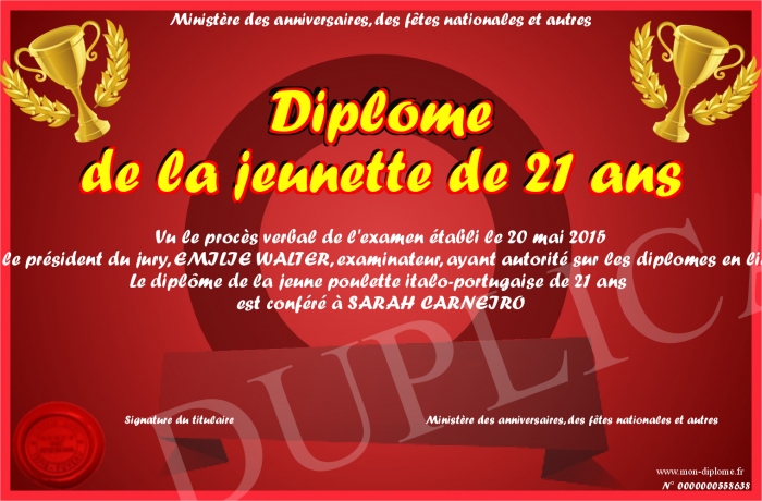 Envoyez par email votre Diplôme de la jeunette de 21 ans personalisé