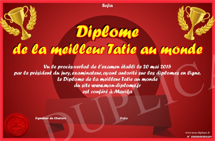 Envoyez par email votre Diplôme de la meilleur Tatie au monde personalisé