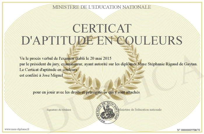 Envoyez par email votre Certicat d'aptitude en couleurs personalisé
