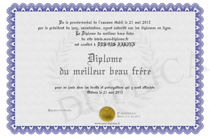 Envoyez par email votre Diplôme du meilleur beau frére personalisé