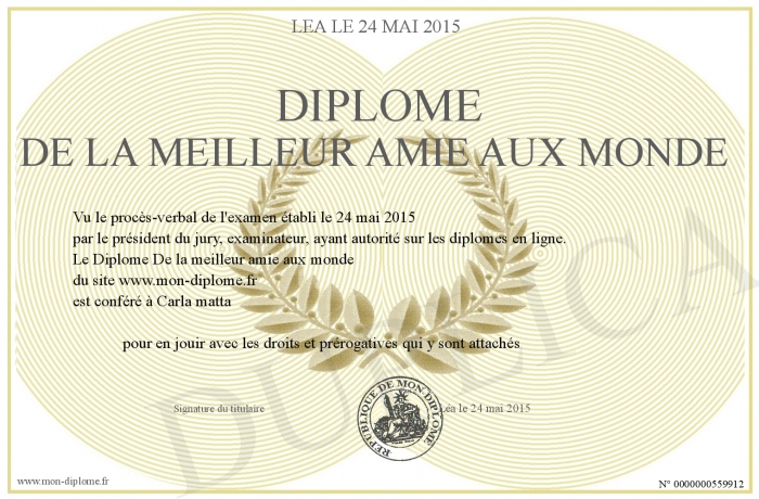 Envoyez par email votre Diplôme De la meilleur amie aux monde personalisé