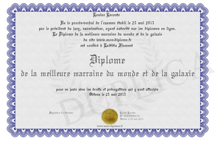 Envoyez par email votre Diplôme de la meilleure marraine du monde et de la galaxie personalisé