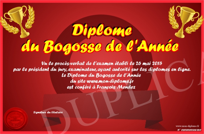 Envoyez par email votre Diplôme du Bogosse de l'Année personalisé