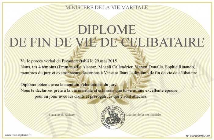 Envoyez par email votre Diplôme de fin de vie de célibataire personalisé
