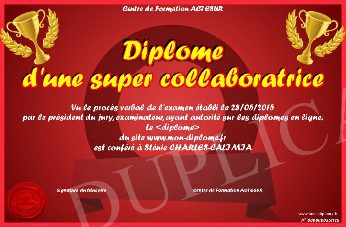 Envoyez par email votre Diplôme d'une super collaboratrice personalisé