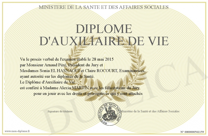 Envoyez par email votre Diplôme d'Auxiliaire de Vie personalisé