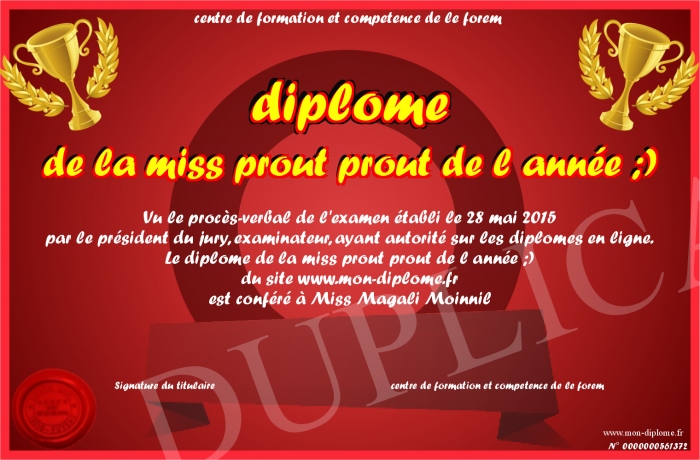 Envoyez par email votre diplome de la miss prout prout de l année ;) personalisé