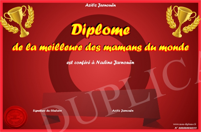 Envoyez par email votre Diplôme de la meilleure des mamans du monde personalisé