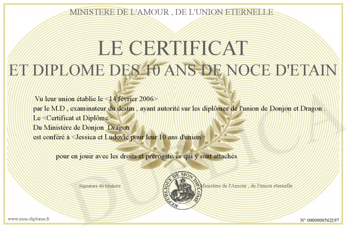 Envoyez par email votre Le Certificat et Diplôme des 10 ans de Noce d'étain personalisé
