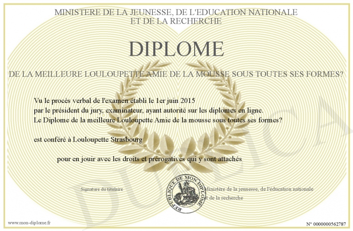 Envoyez par email votre Diplôme de la meilleure Louloupette Amie de la mousse sous toutes ses formes? personalisé