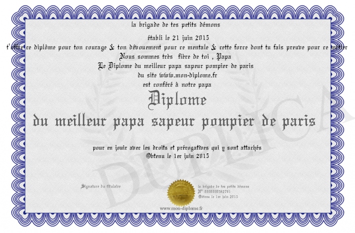 Envoyez par email votre Diplôme du meilleur papa sapeur pompier de paris personalisé