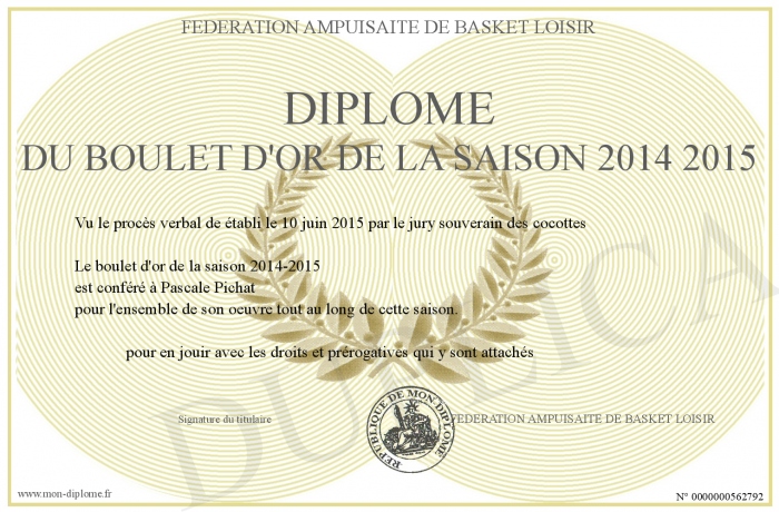 Envoyez par email votre DIPLOME DU BOULET D'OR DE LA SAISON 2014 2015 personalisé