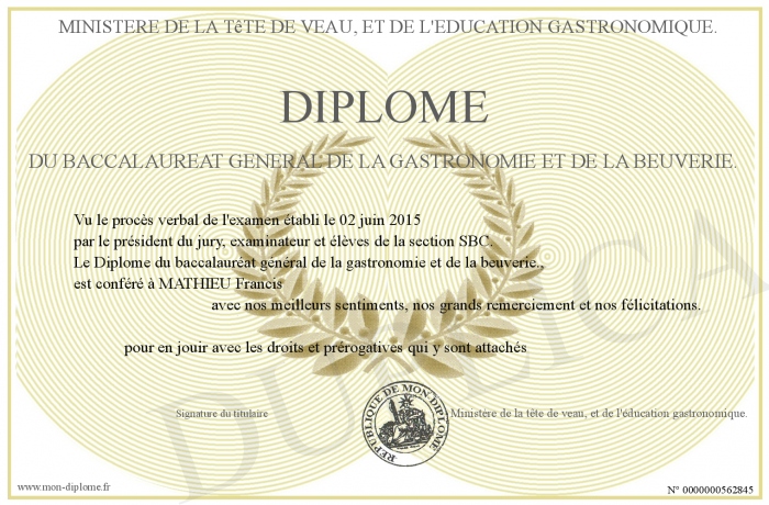 Envoyez par email votre Diplôme du baccalauréat général de la gastronomie et de la beuverie. personalisé
