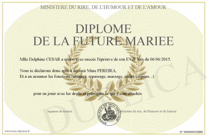 Envoyez par email votre Diplôme de la future mariée personalisé