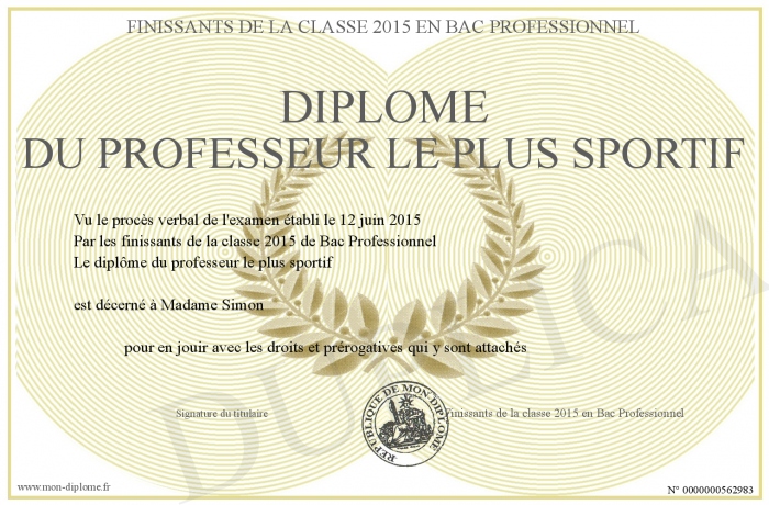 Envoyez par email votre Diplôme du professeur le plus sportif personalisé