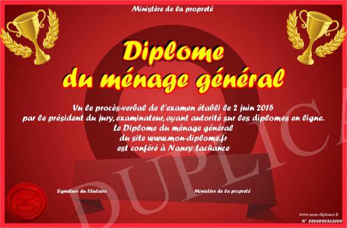 Envoyez par email votre Diplôme du ménage général personalisé