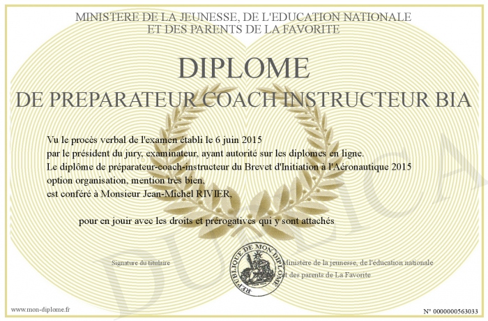 Envoyez par email votre Diplôme de préparateur coach instructeur BIA personalisé