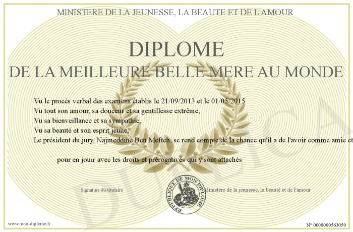 Envoyez par email votre Diplôme de la meilleure Belle mère au monde personalisé
