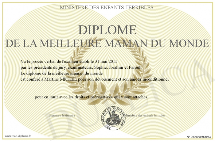 Envoyez par email votre Diplôme de la meilleure maman du monde personalisé