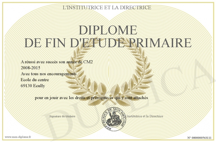 Envoyez par email votre Diplôme de fin d'étude primaire personalisé