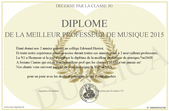 Envoyez par email votre diplome de la meilleur professeur de musique 2015 personalisé