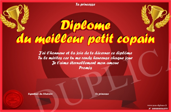 Envoyez par email votre Diplôme du meilleur petit copain personalisé