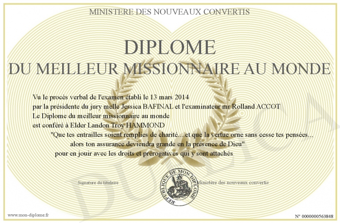 Envoyez par email votre Diplôme du meilleur missionnaire au monde personalisé