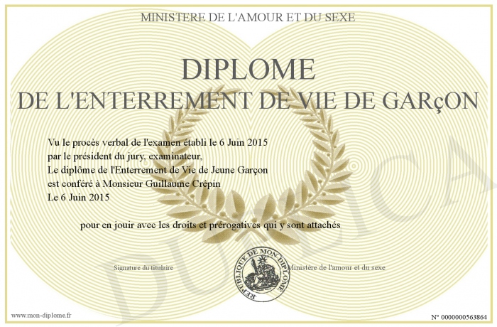 Envoyez par email votre Diplôme de l'Enterrement de vie de Garçon personalisé